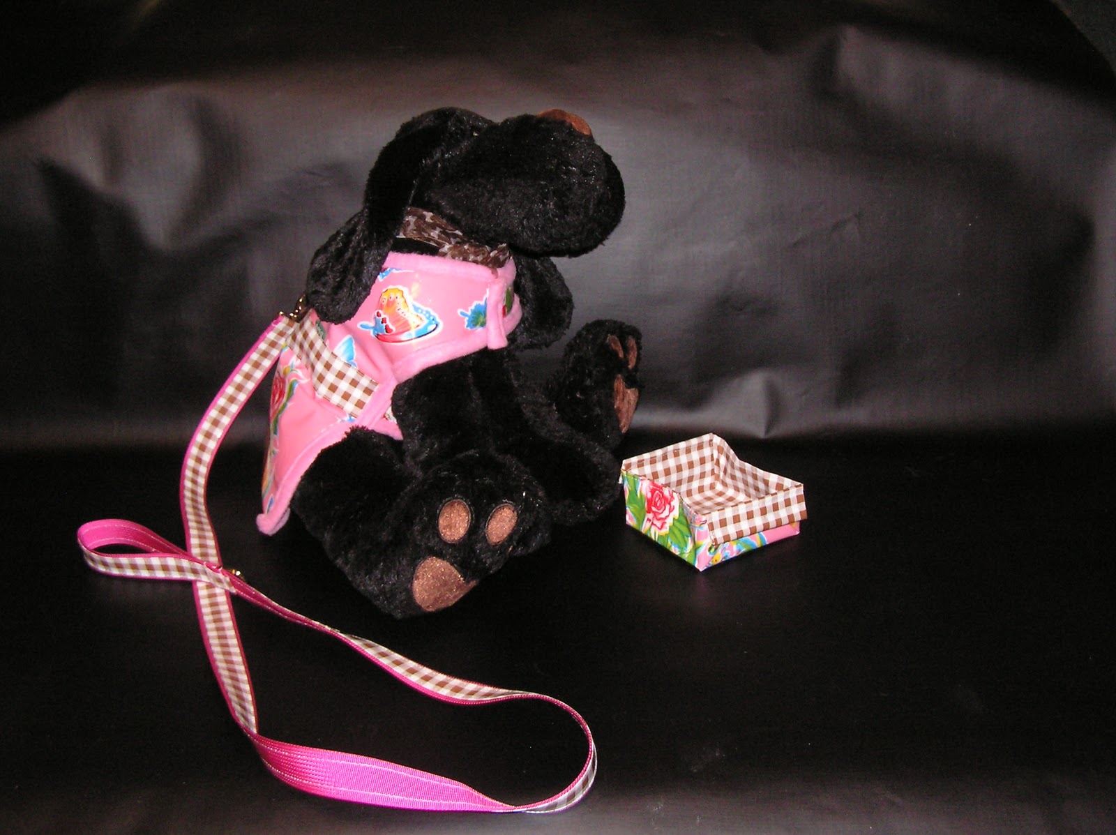 The coordinating leash is made from nylon webbing and oilcloth. It has a nickel swivel clip and a ring at the handle to hook your keys while you stroll about town. There is also a small travel foldaway dish when your sidekick needs a drink or a snack.